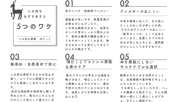 ぽけっとのシカおやつは、人間用のシカ肉と同じ品質で作っています。